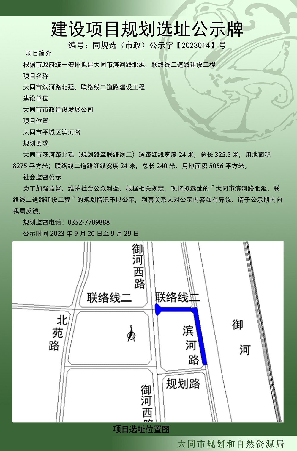 同规选(市政)公示字[2023014]号 建设项目规划选址公示牌