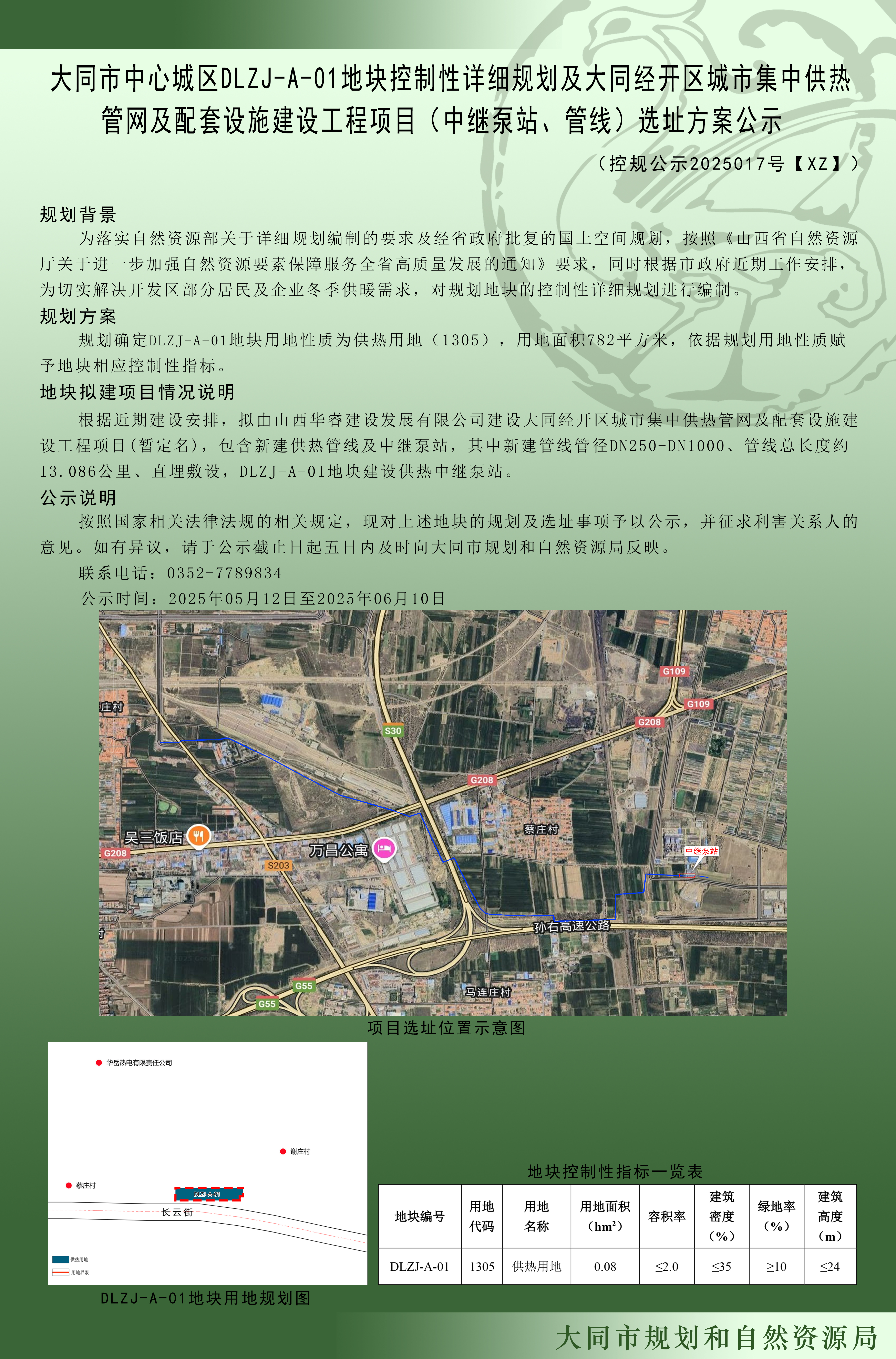 大同市中心城区DLZJ-A-01地块控制性详细规划及大同经开区城市集中供热管网及配套设施建设工程项目(中继泵站、管线)选址方案公示(控规公示2025017号【XZ】)
