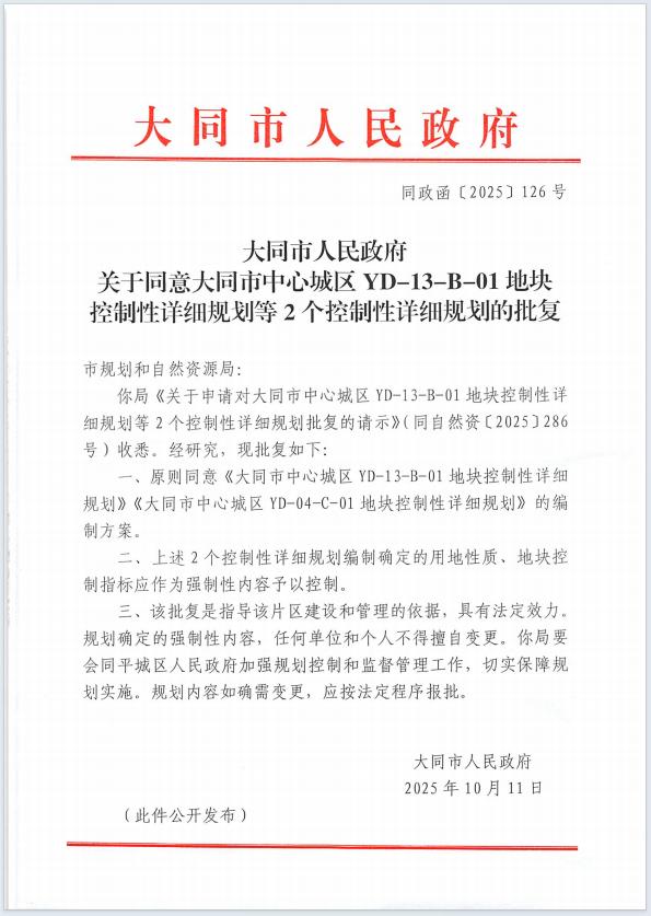 该控规于2025年10月11日经大同市人民政府批准同意(同政函【2025】126号)