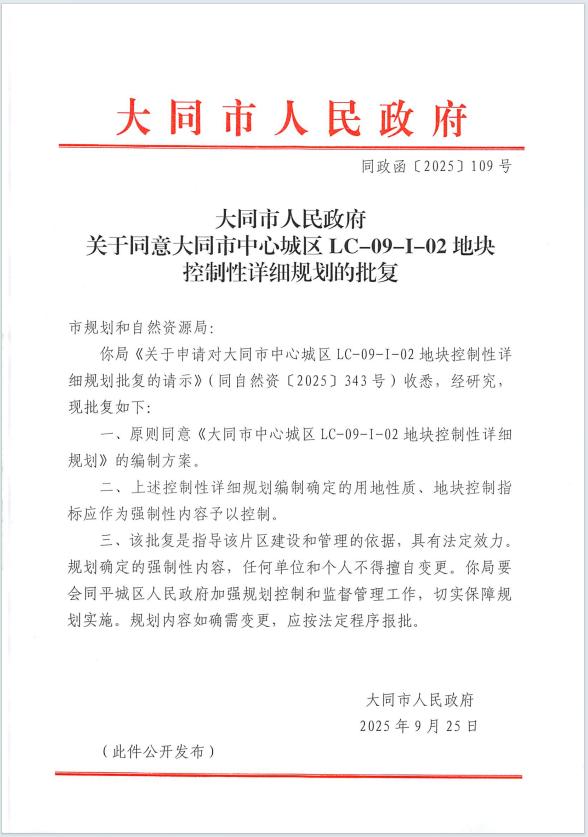 该控规于2025年9月25日经大同市人民政府批准同意(同政函【2025】109号)